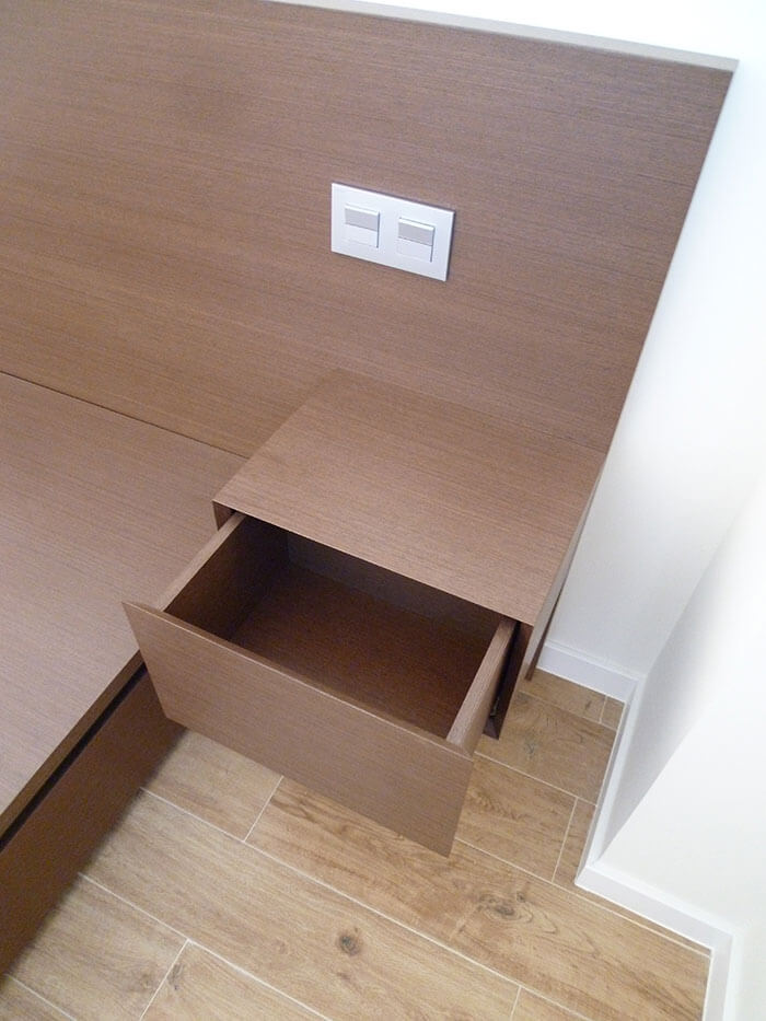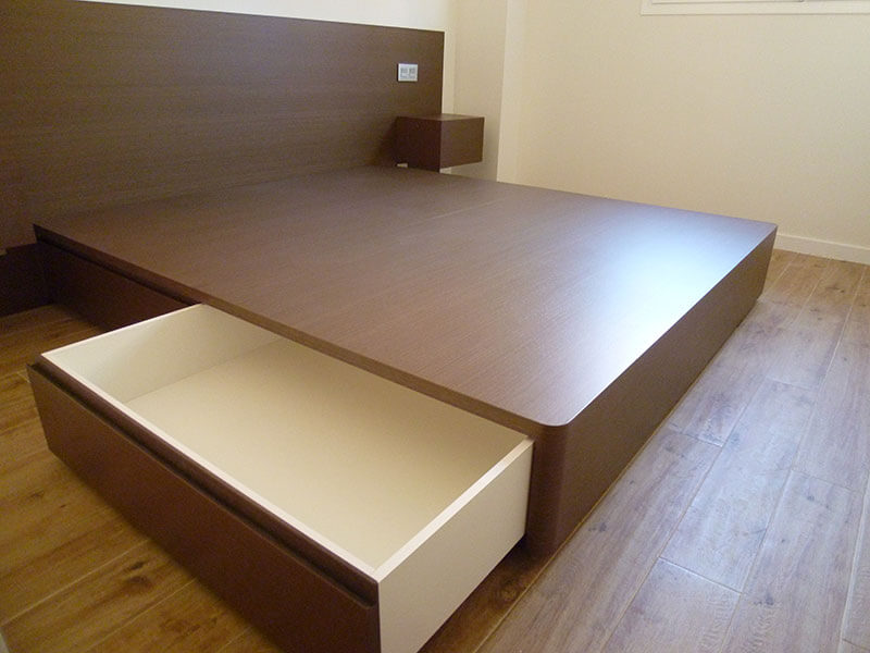 La cama está formada por dos cuerpos y lleva cuatro cajones con guías de auto-cierre. Las mesillas tienen los frentes ingleteados para conseguir la forma de prisma cerrado. El conjunto es totalmente desmontable.