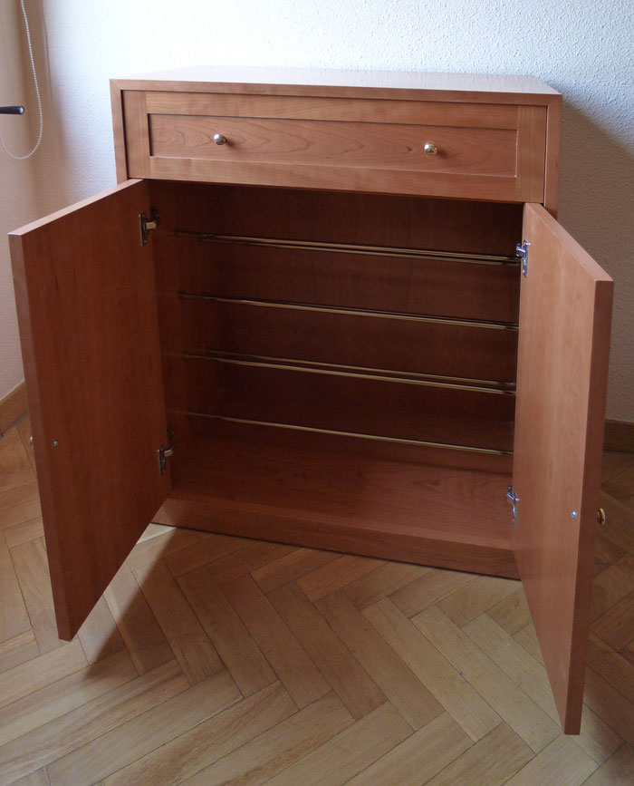 View Larger Image View Larger Image Project Description Zapatero con ruedas y cajón, en madera de cerezo barnizada. Project Details Categories: AparadoresZapateros Tags: Zapateros en Madrid Proyectos relacionados Armario lacado con puertas acristaladas Galería Armario lacado con puertas acristaladas Cristalero con puertas independientes Galería Cristalero con puertas independientes Aparador colgante en roble barnizado Galería Aparador colgante en roble barnizado MUEBLE ZAPATERO PLASTIFICADO Galería MUEBLE ZAPATERO PLASTIFICADO APARADOR Galería APARADOR